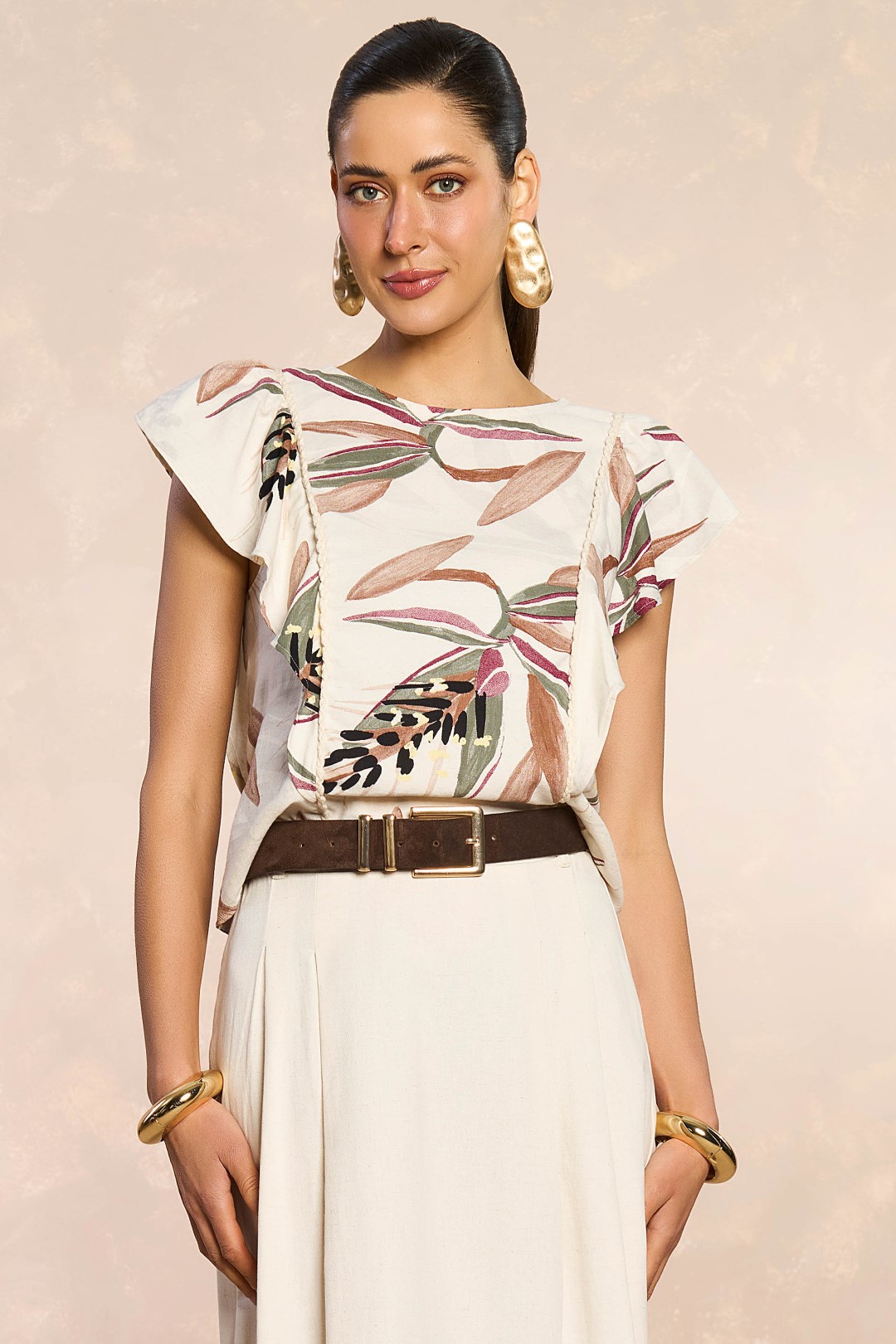 Blusa confeccionada em viscolinho, estampada, decote redondo, detalhe de cordão e babado.