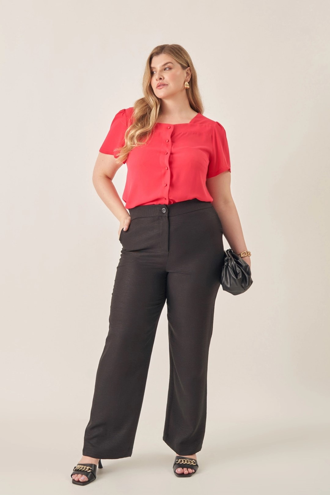 Calça confeccionada em crepe, na cor preta, modelo pantalona, fechamento frontal em botão e zíper, elástico na cintura na parte das costas e bolsos frontais funcionais.