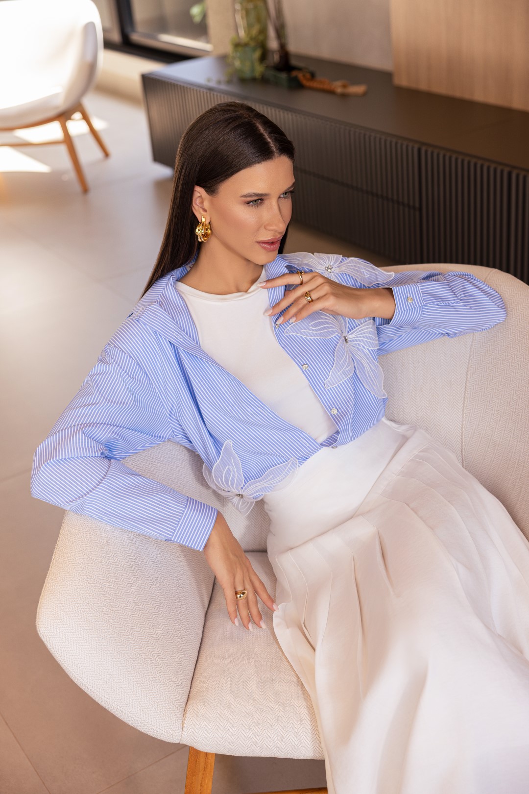 Camisa feminina confeccionada em tricoline listrado, com bordado floral delicado que adiciona sofisticação e charme à peça. O modelo conta com gola clássica, fechamento por botões frontais com strass e mangas longas, unindo estilo moderno e elegância atemporal. Versátil, pode ser usada em composições casuais ou sofisticadas, garantindo um visual feminino e refinado para diversas ocasiões.