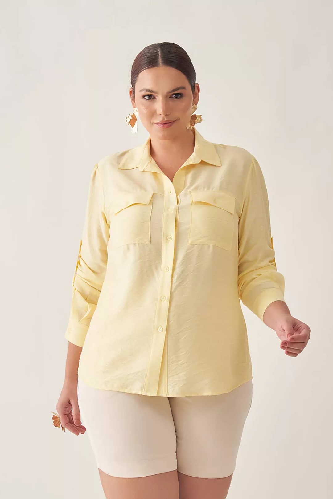 Camisa Plus Size Amarela Em Viscose Com Poliamida E Bolsos Frontais - 32043