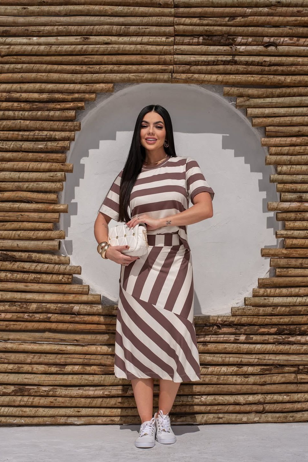 Conjunto De Saia Midi Listrado De Cru E Marrom Em Malha Com Botões Laterais - 2062