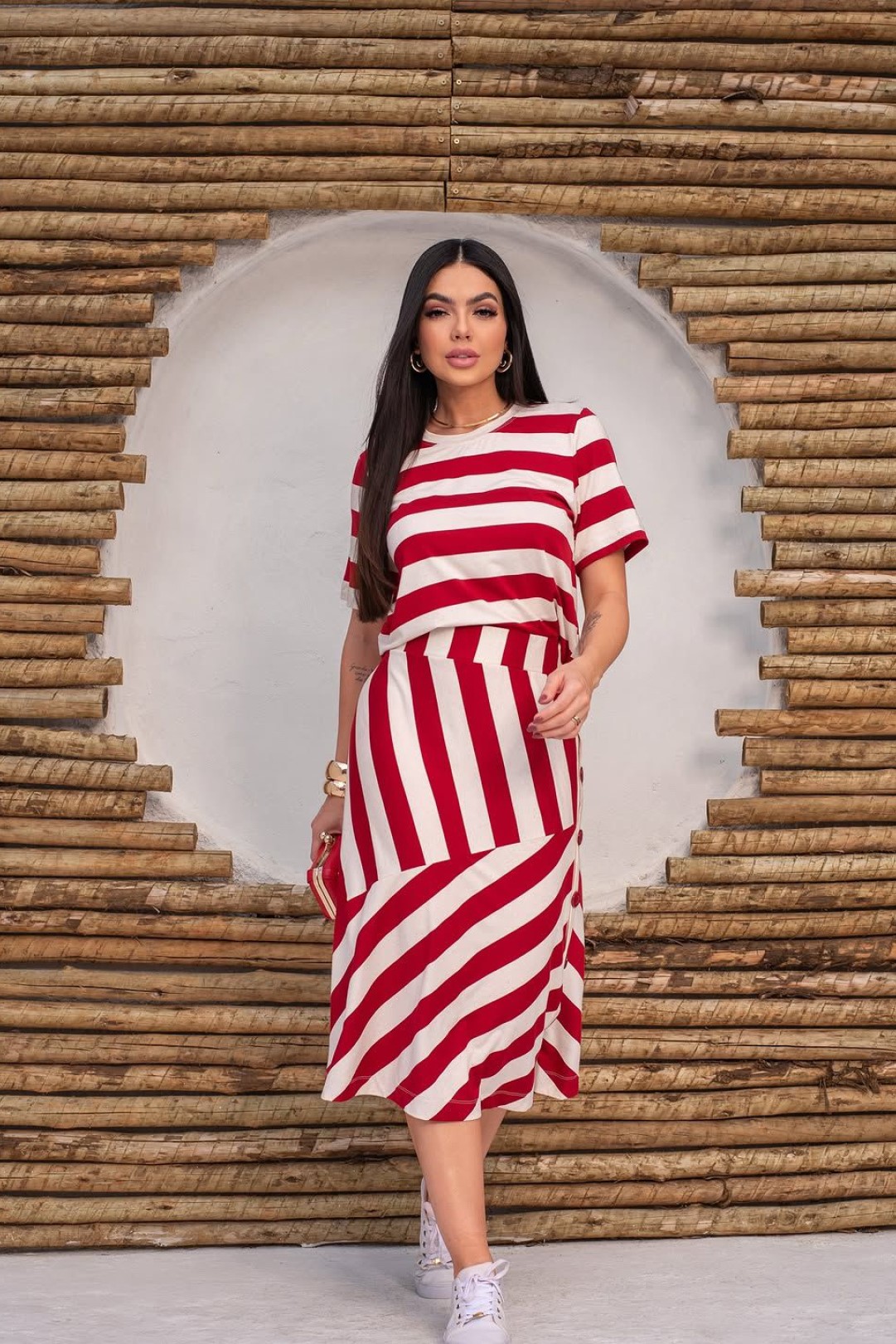 Conjunto De Saia Midi Listrado De Cru E Vermelho Em Malha Com Botões Laterais - 2062