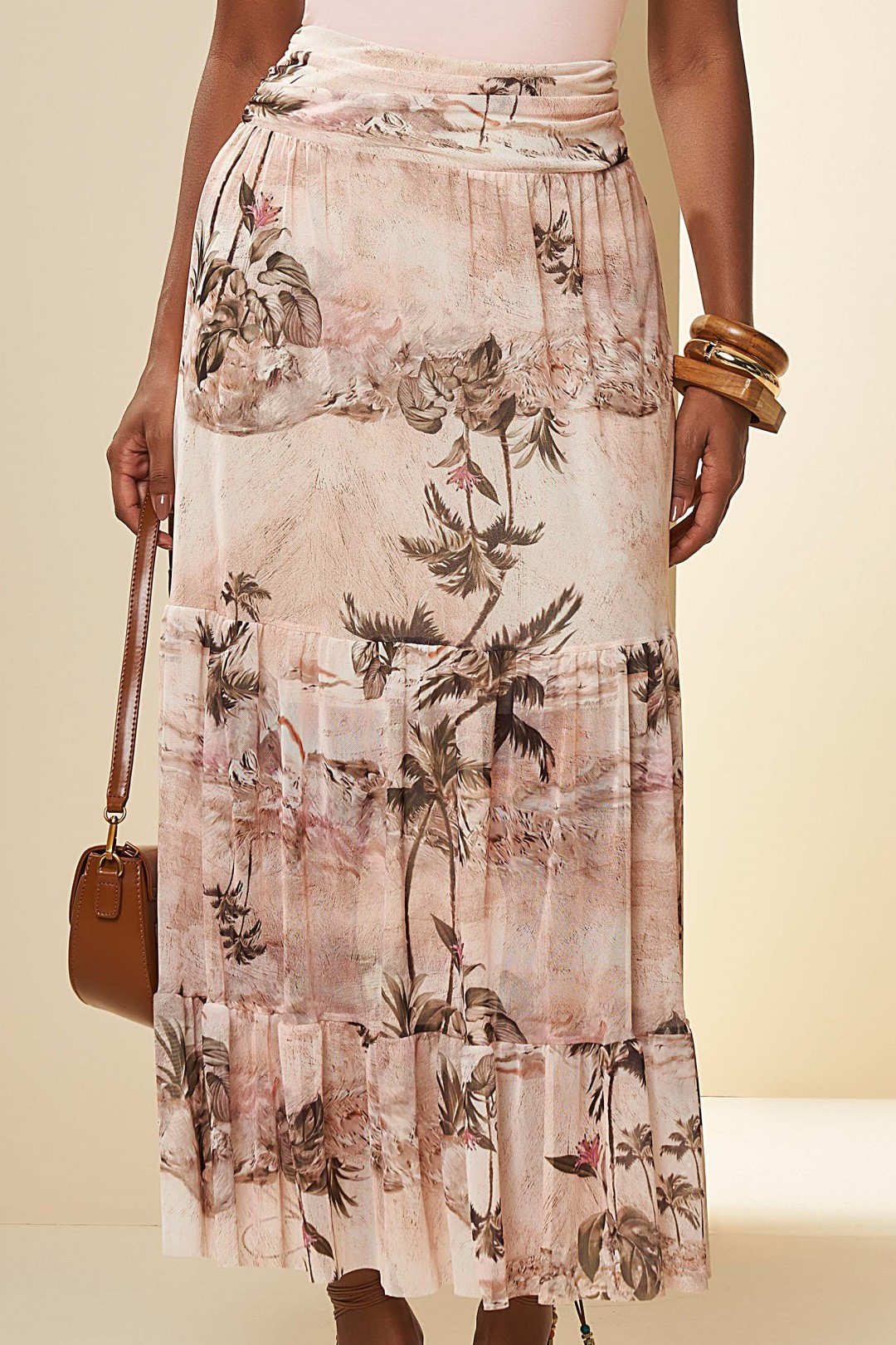 Saia Longa Três Marias Estampada Em Tule Com Franzido Na Cintura Doce Trama - 105873