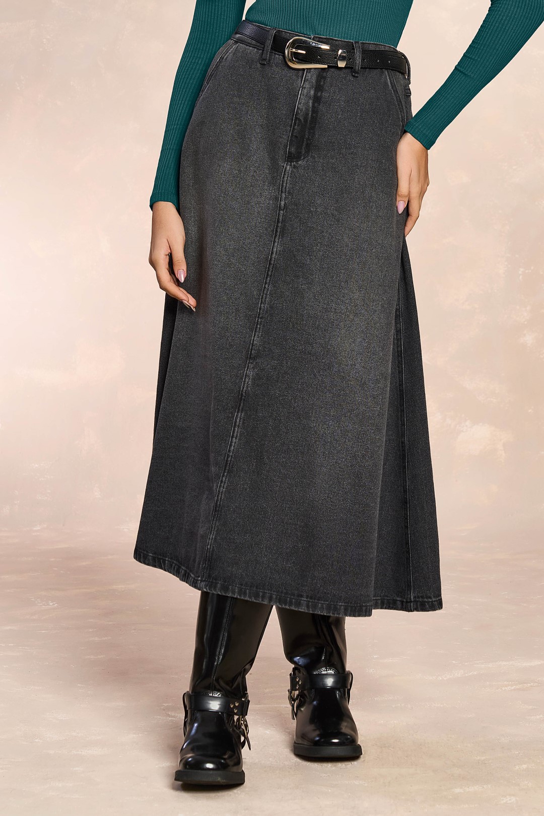 Saia Maxi Midi Em Denim Black Com Bolsos Frontais E Traseiros Doce Trama - 106048