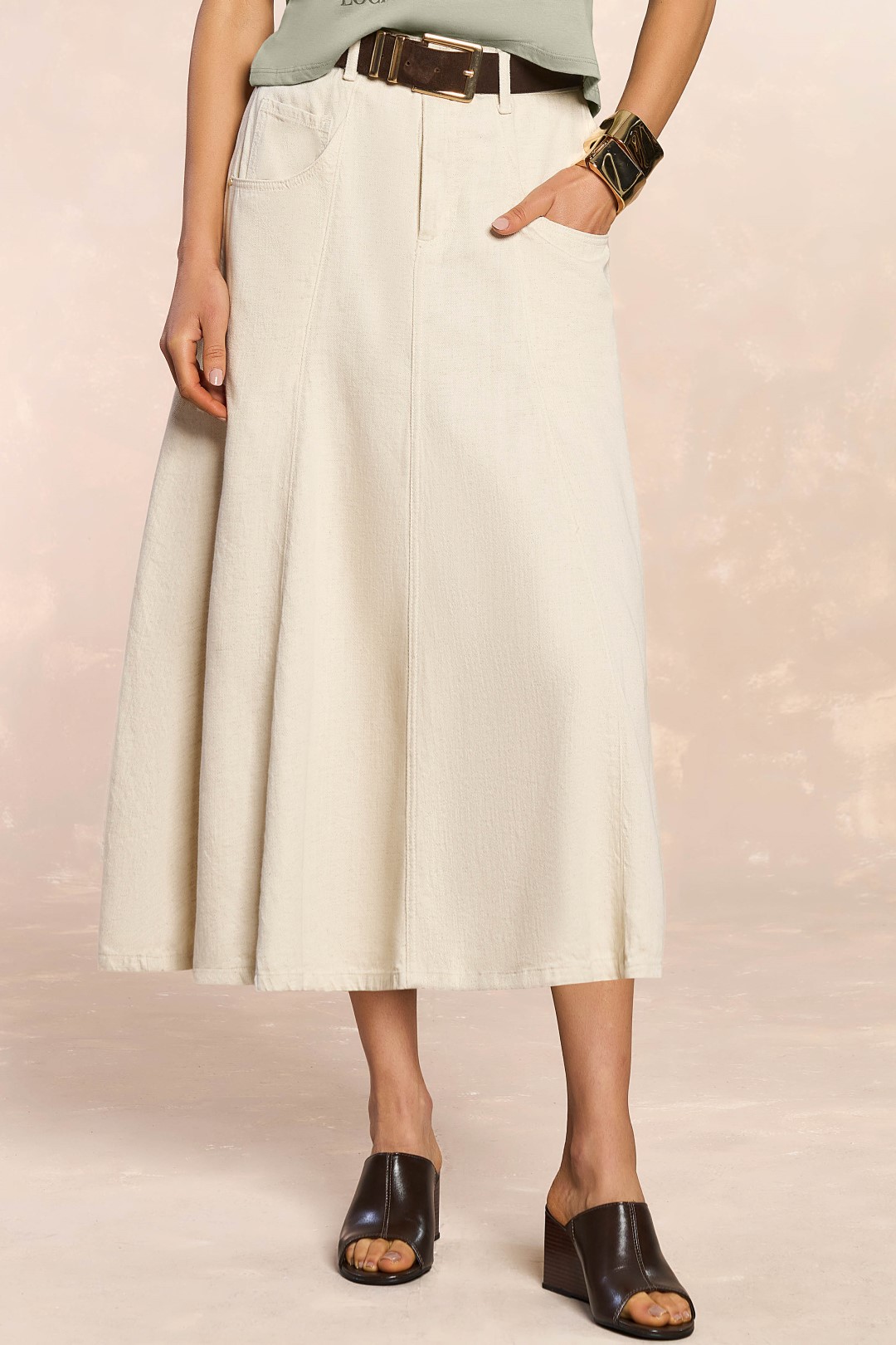 Saia Midi Cru Em Sarja Com Linho Bolsos Frontais E Traseiros Doce Trama - 106283