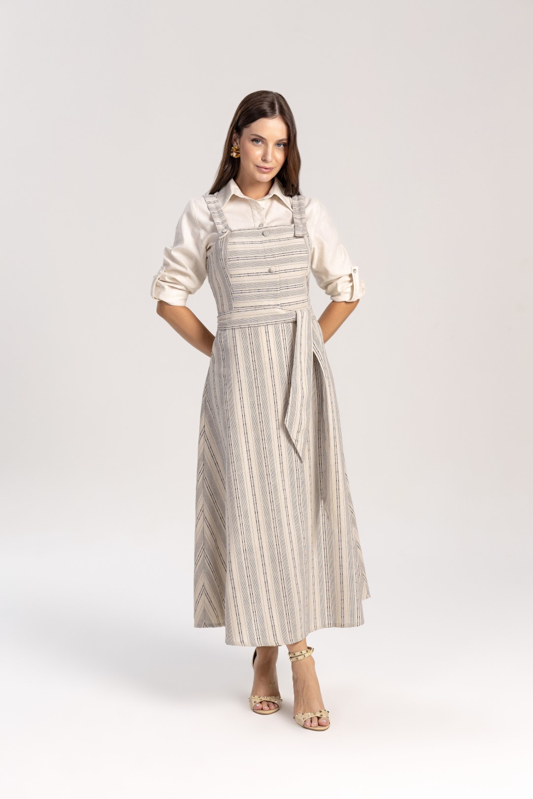 Salopete de tecido plano listrada confeccionada em tecido de altíssima qualidade, cor de linha: off white, aviamentos em banho metalizado dourado, fechamento traseiro em zíper, bolso frontal funcional, alça com botão encapado e acompanha faixa para amarração, comprimento de 1,20cm.