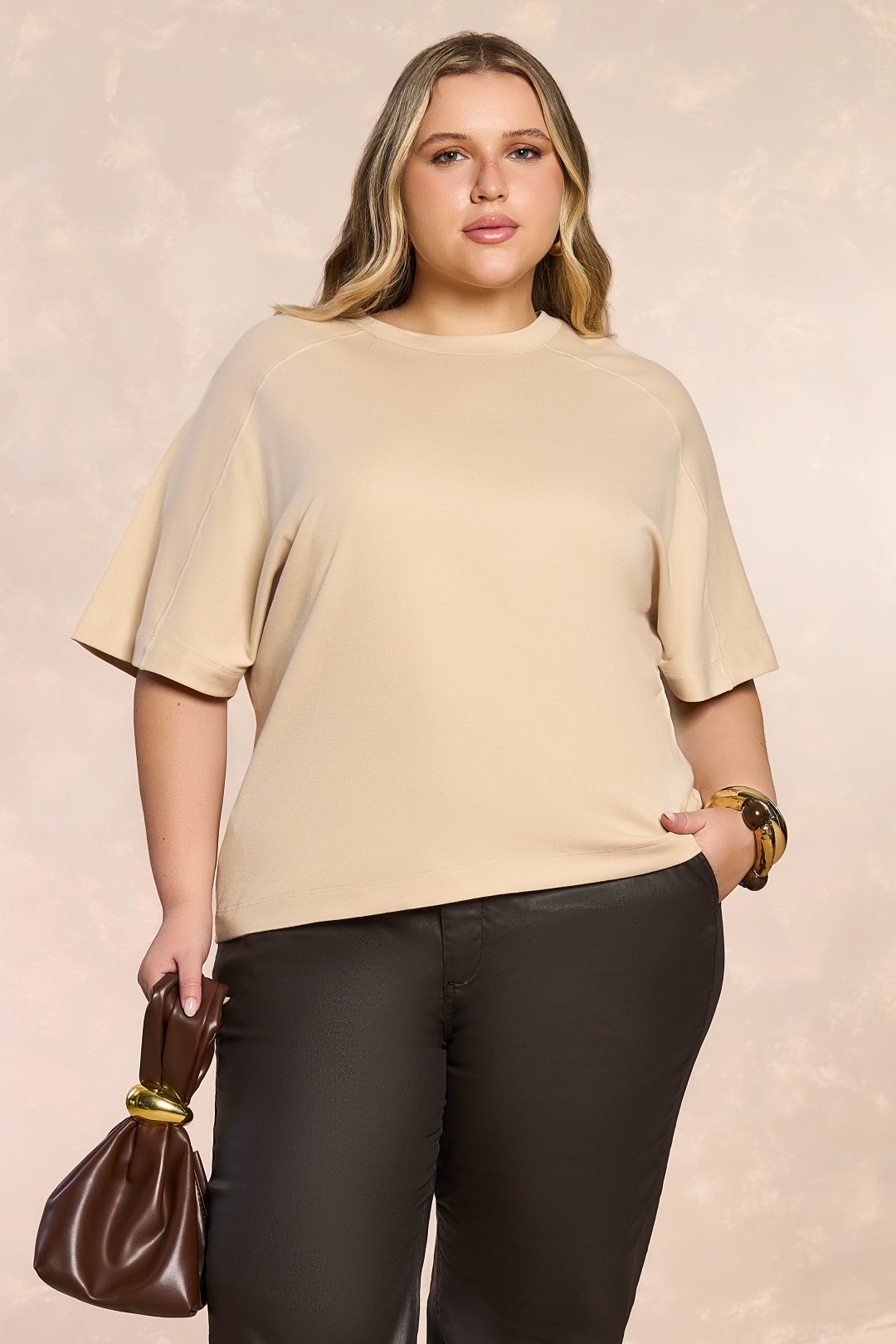 T-Shirt confeccionada em malha suedine, na cor caqui, decote redondo e manga morcego curta.