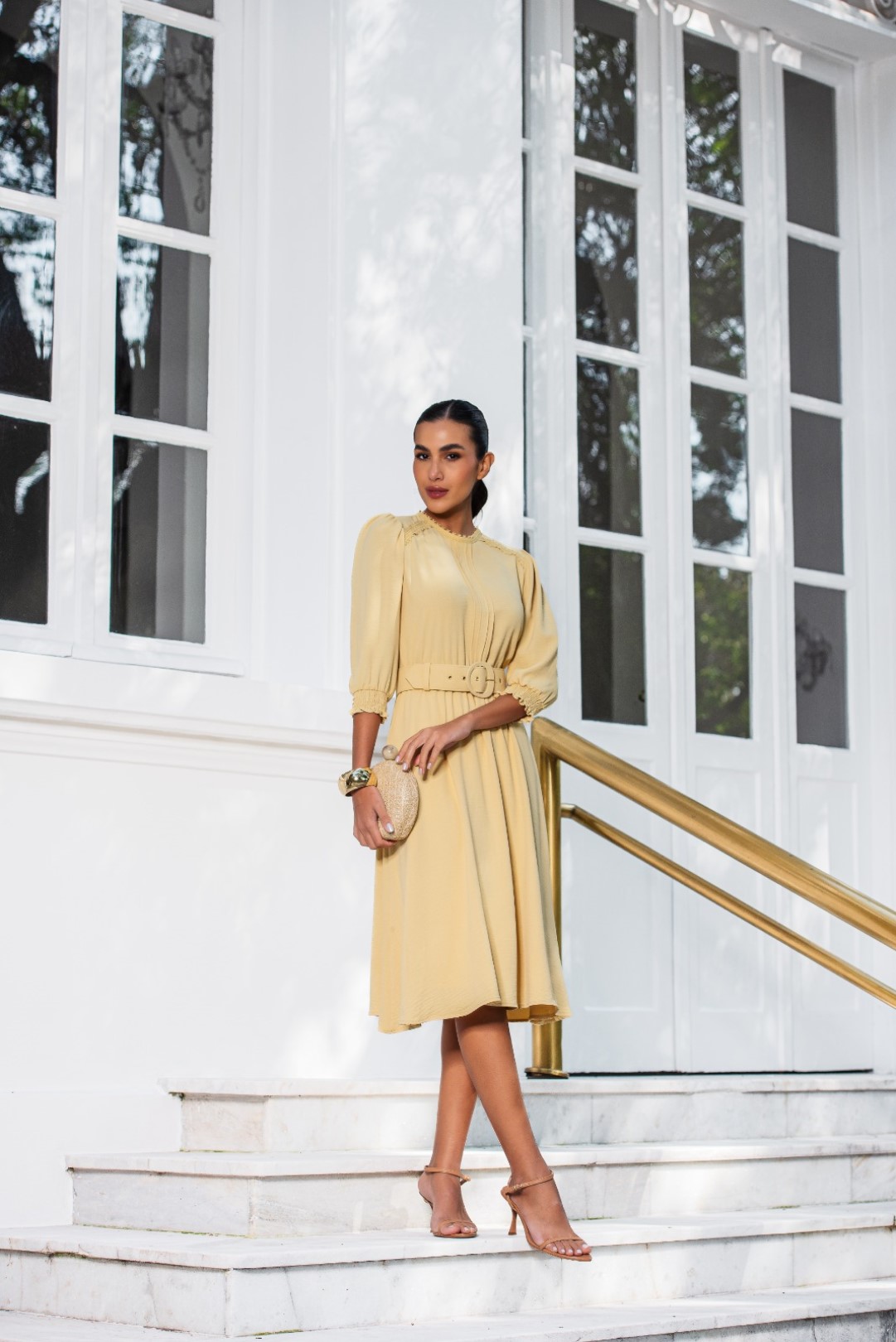 Vestido Amarelo Em Crepe Com Detalhes Em Renda E Acompanha Cinto Tatá Martello - 5927