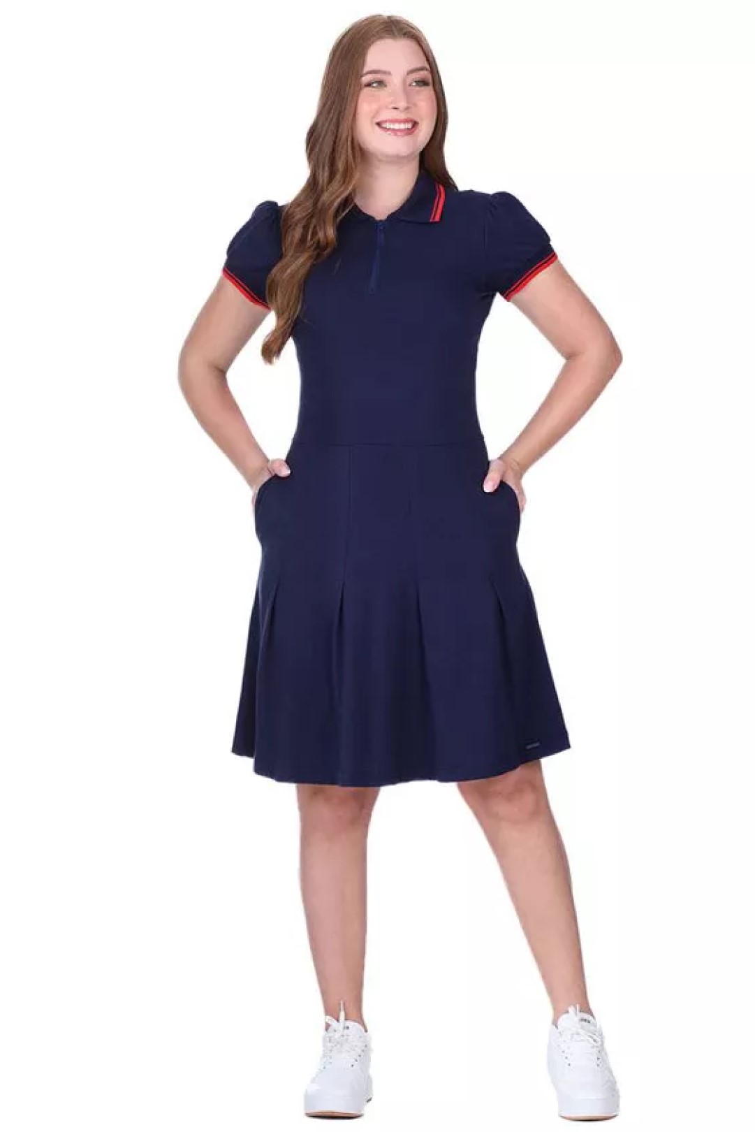 O vestido Luisa foi confeccionado em malha cotton. O modelo apresenta decote com gola polo, detalhe em zíper, suas mangas são curtas com punho, os bolsos são funcionais, seu shape é acinturado com volume na saia. Esse vestido é ideal para quem ama um look confortável.