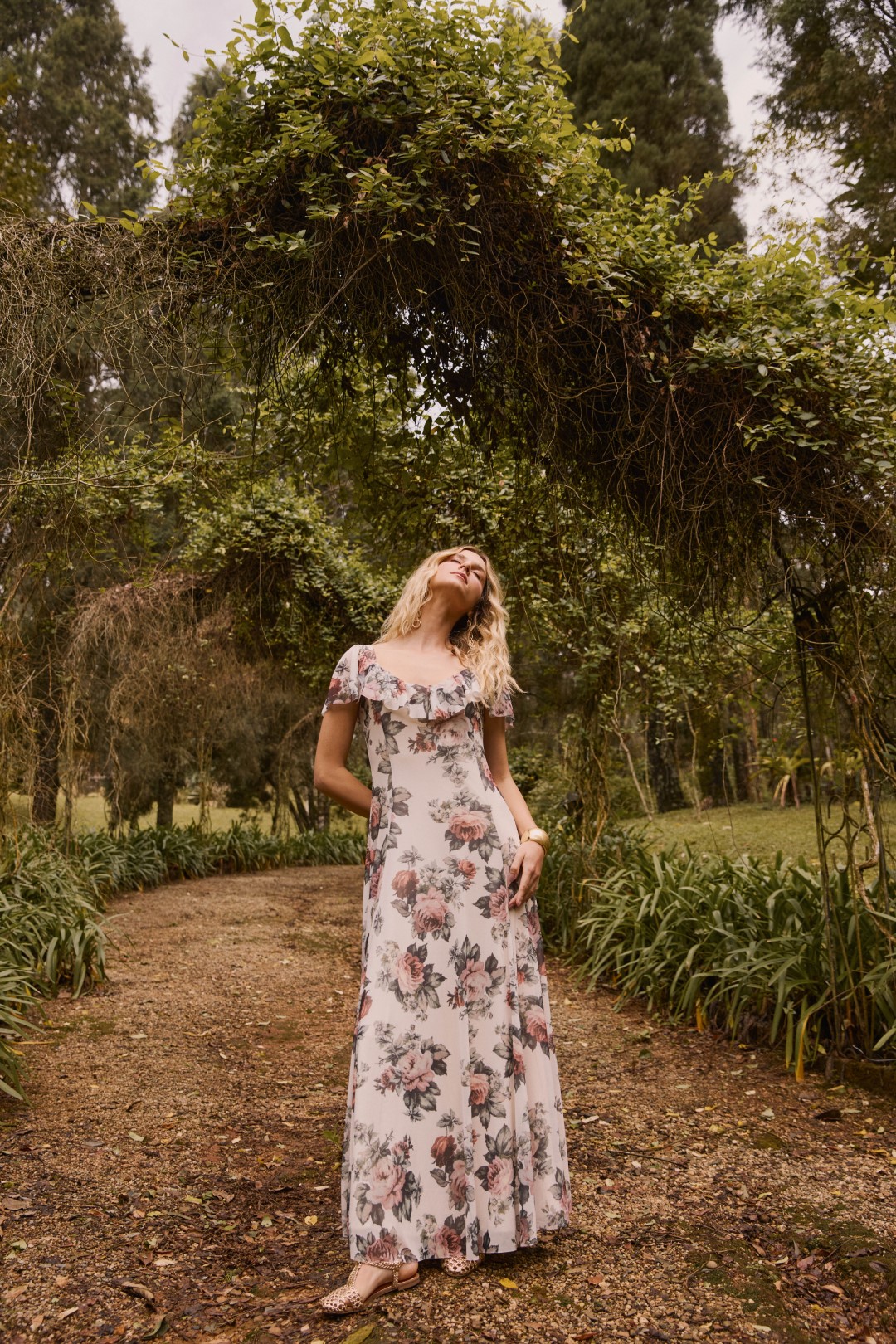 Vestido confeccionado em tule, estampado, forrado, decote princesa com babado, manga curta e comprimento longo.
