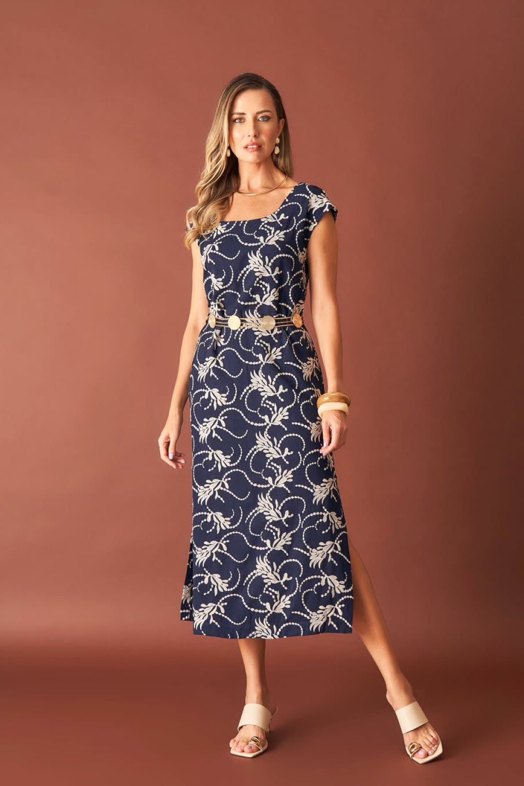 Vestido confeccionado em viscolinho com algodão, na cor azul com bordado off white, decote redondo, comprimento maxi midi e fendas laterais.