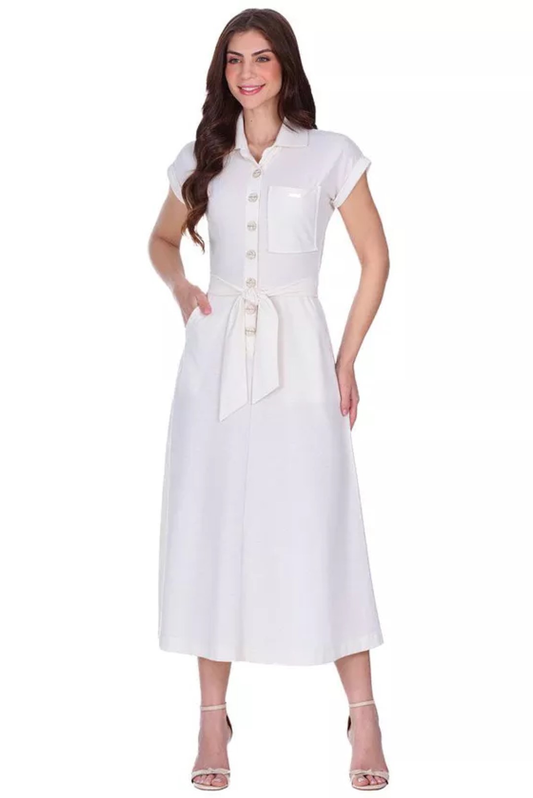 Vestido Maxi Midi Cru Em Malha Piquet Com Botões Frontais E Acompanha Faixa Hapuk - 61979