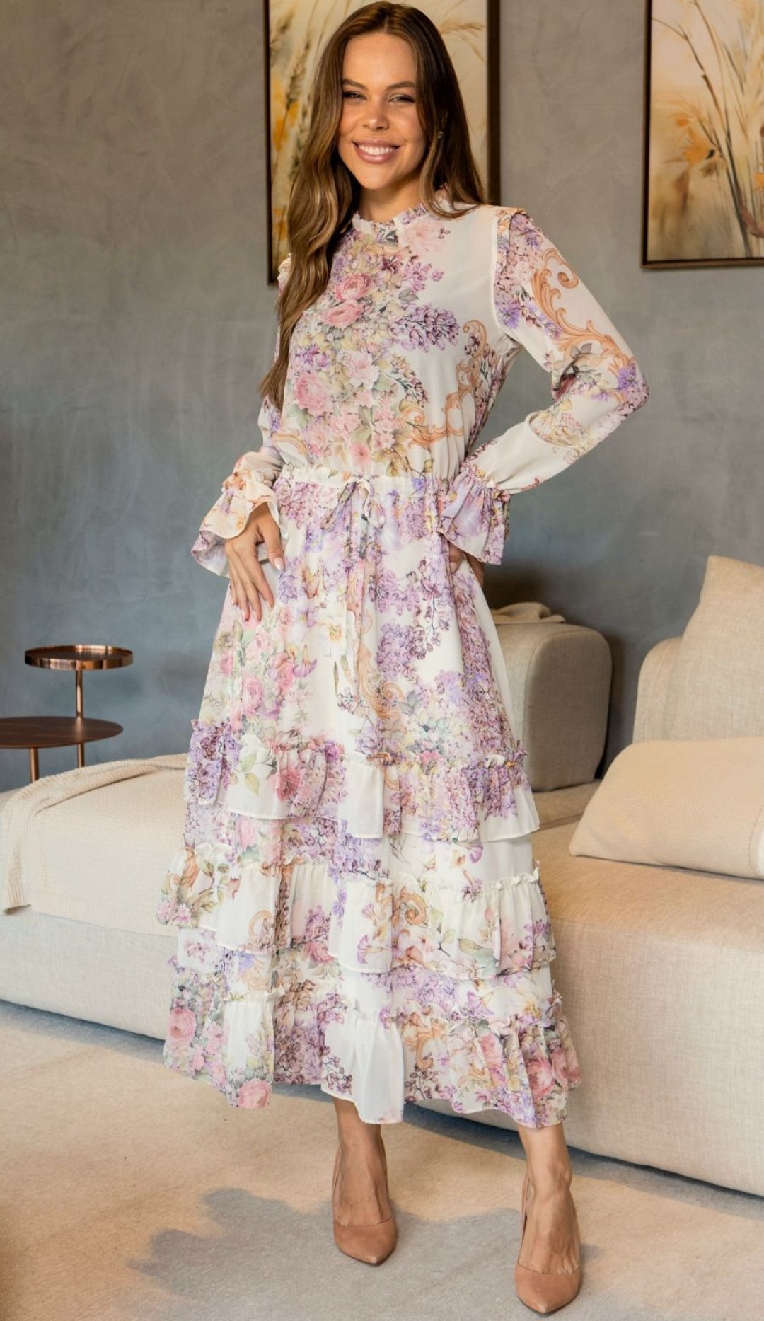 Vestido confeccionado em chiffon, forrado, estampado, gola alta, manga longa com elástico, canaleta com cordão ajustável na cintura, comprimento maxi midi com babados.
