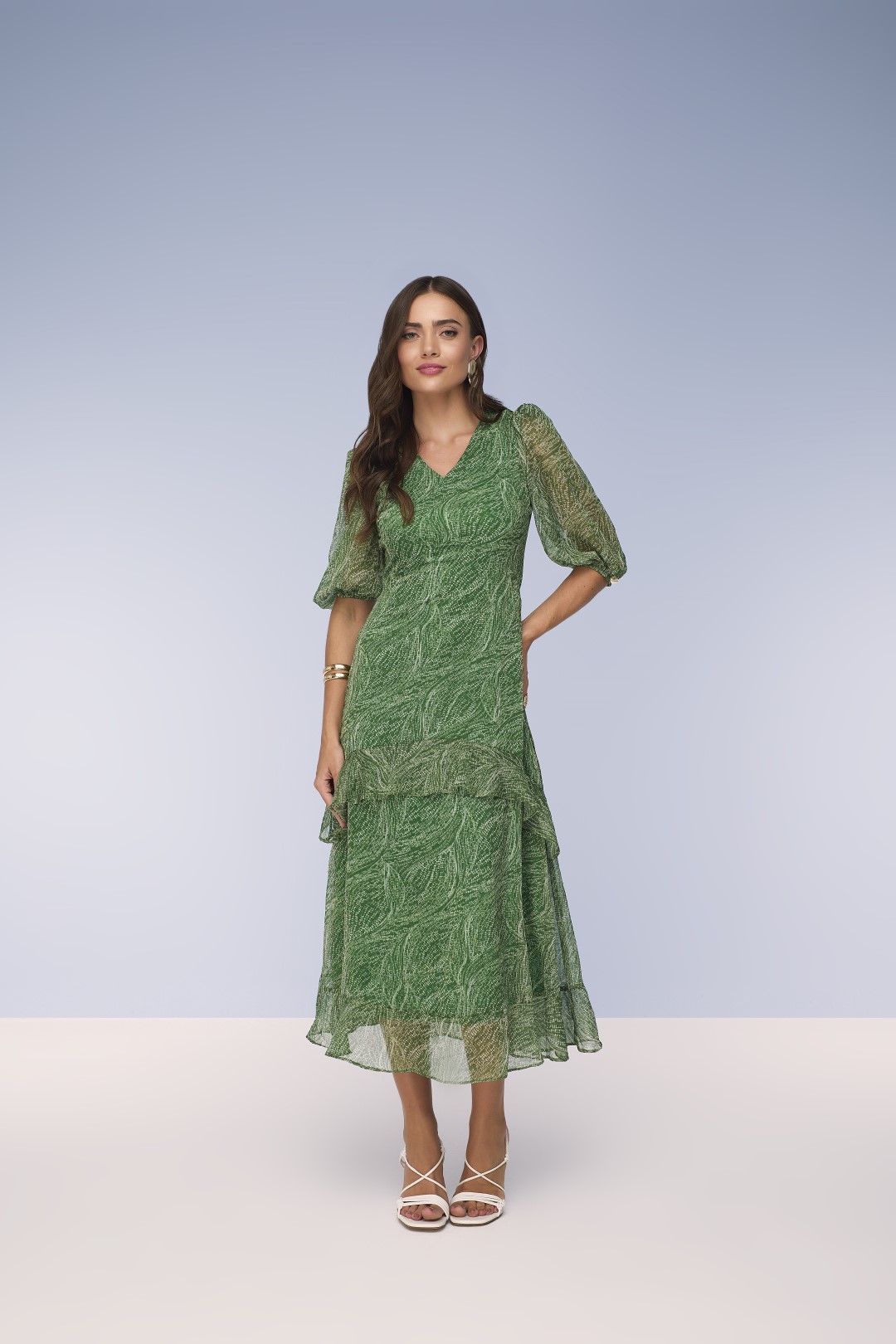 Vestido chiffon em tecido de altíssima qualidade, cor de linha verde, aviamentos em banho dourado. Fechamento traseiro com zíper, Gola v. Detalhe em recortes com babado. Comprimento 130 cm.