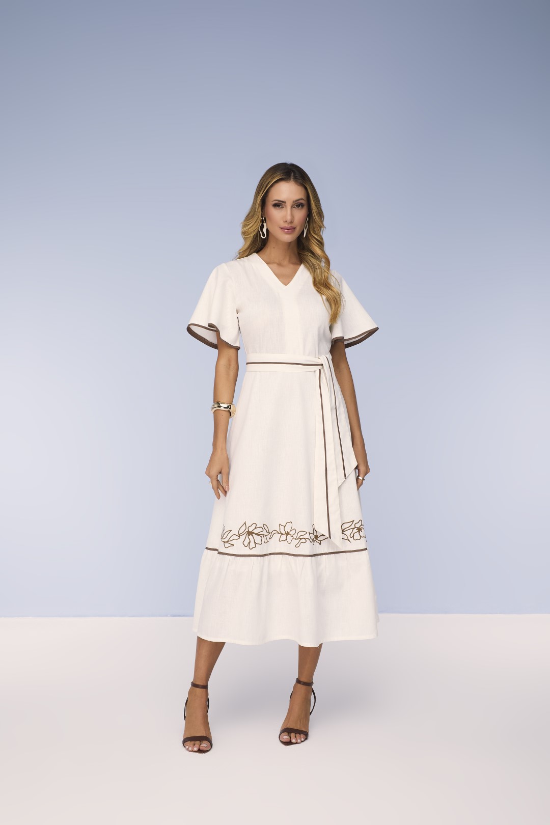 Vestido semi godê confeccionada em tecido de altíssima qualidade, cor de linha off White, aviamentos em banho natural. Comprimento 125 cm. Fechamento traseiro com zíper, manga godê com vivo, decote em v, faixa para amarração, barra com volume. Detalhes em vivo, bordado de flores e folhas caqui.