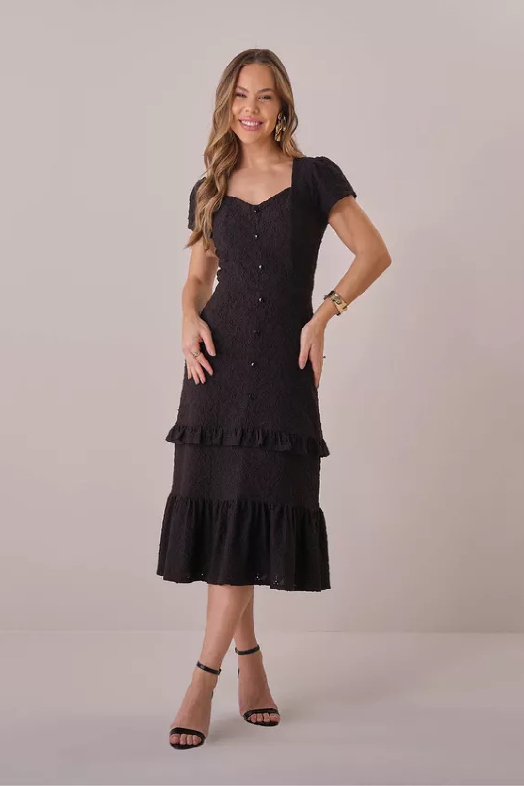 Vestido Midi Preto Em Malha Jacquard Texturizada Com Botões Frontais Tatá Martello - 5770