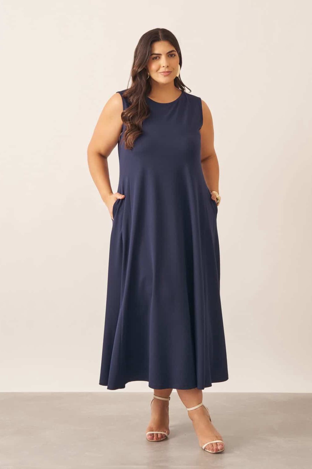 Vestido confeccionado em malha encorpada na cor azul, decote redondo, sem manga, bolsos laterais funcionais e comprimento maxi midi.