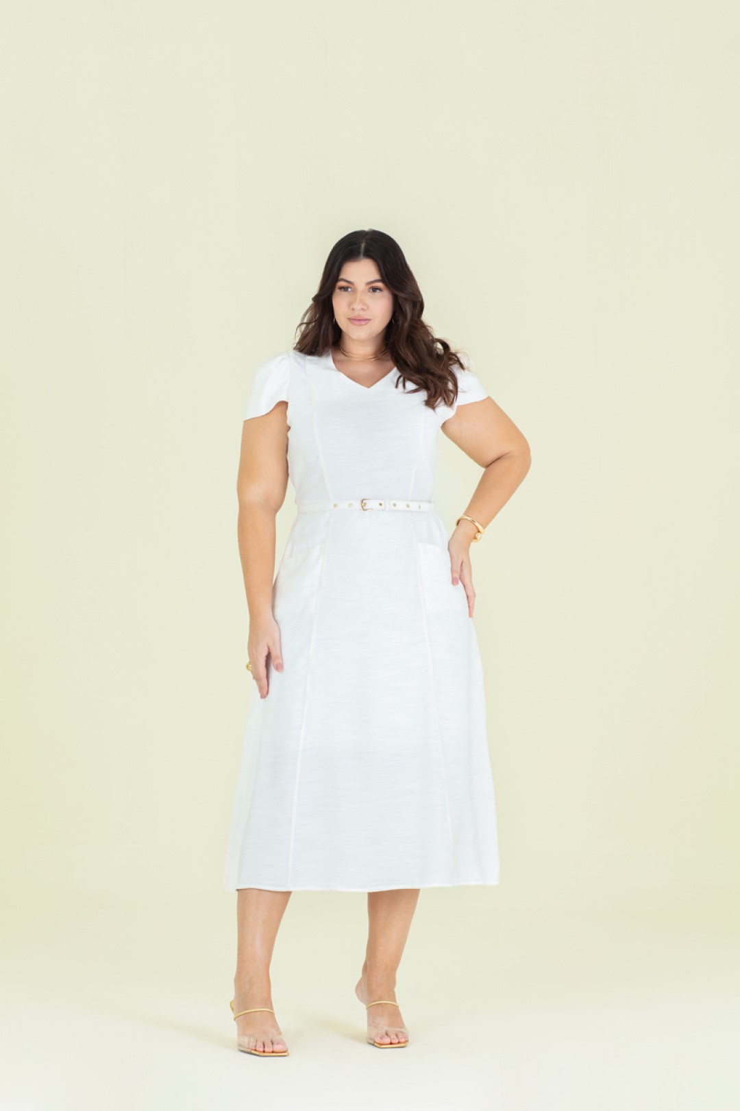 Vestido Plus Size Midi Off White Com Bolsos Frontais E Acompanha Cinto Hadaza - 51493
