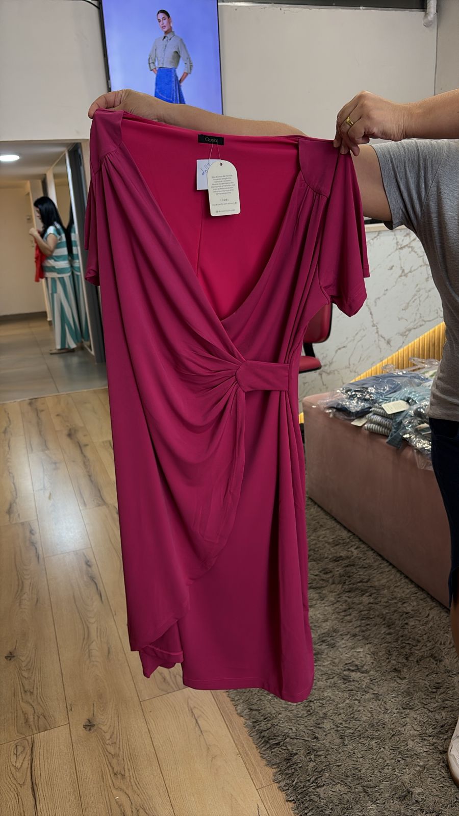 Vestido confeccionado em malha stretch, forrado, na cor pink, decote transpassado, manga curta e detalhe frontal drapeado.