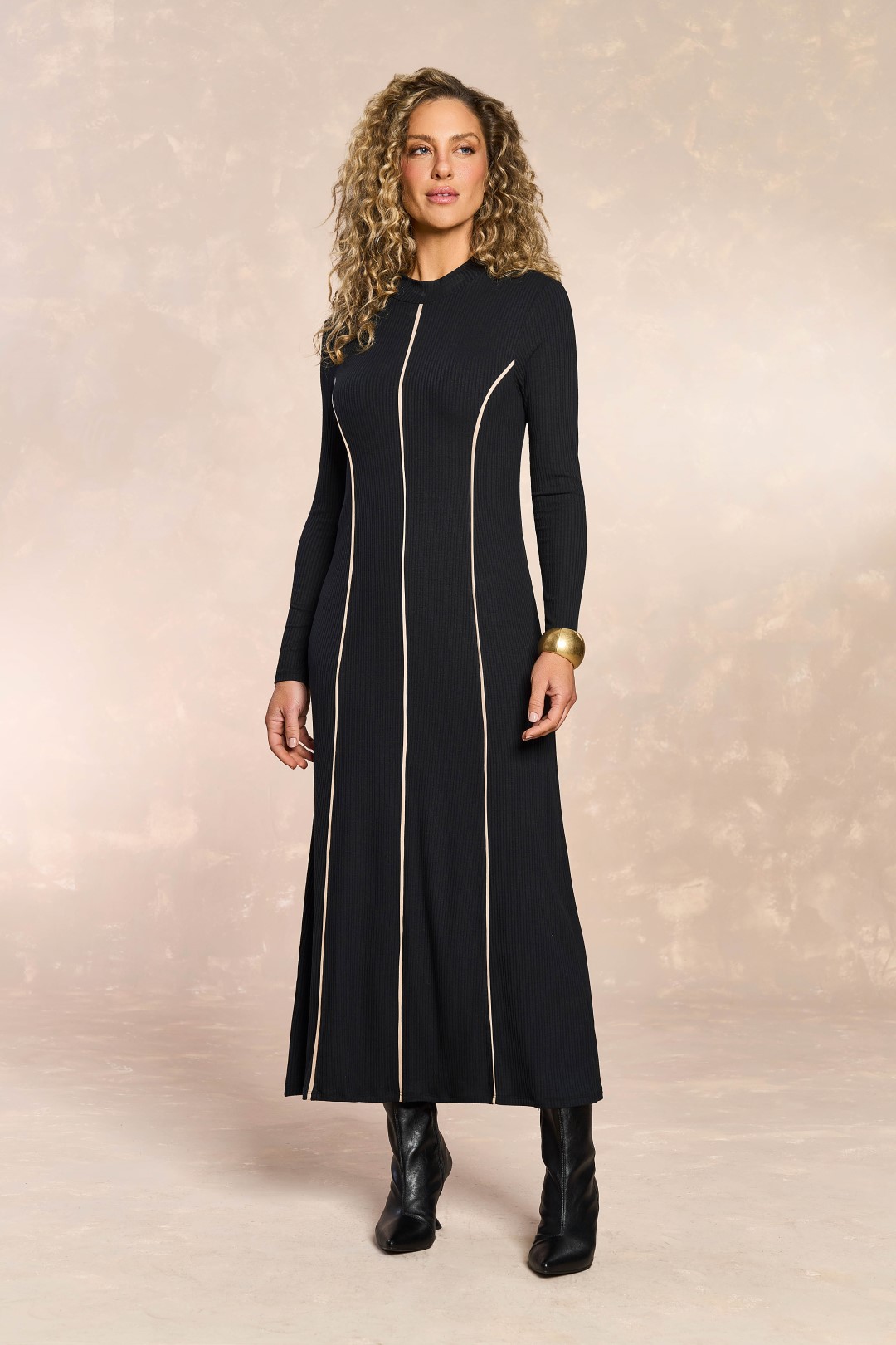 Vestido confeccionado em ribana canelada, na cor preta, gola alta, manga longa, vivo na cor bege e comprimento maxi midi.