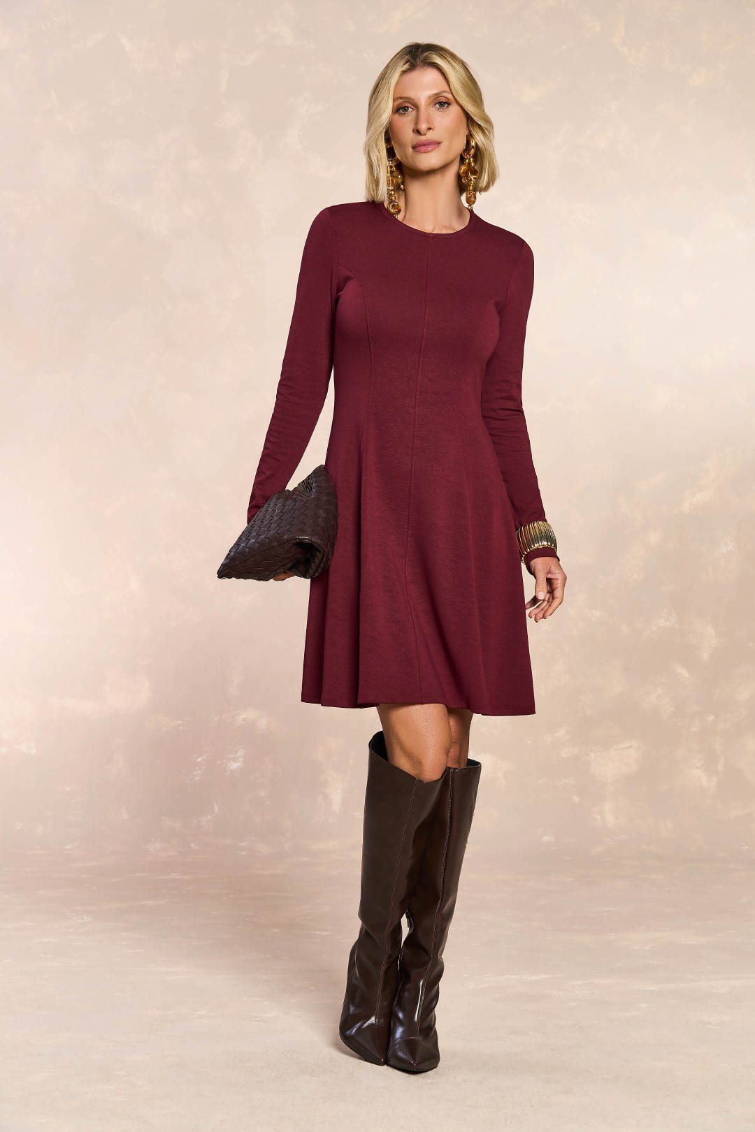Vestido confeccionado em malha bodycon, na cor vinho, decote redondo e manga longa.